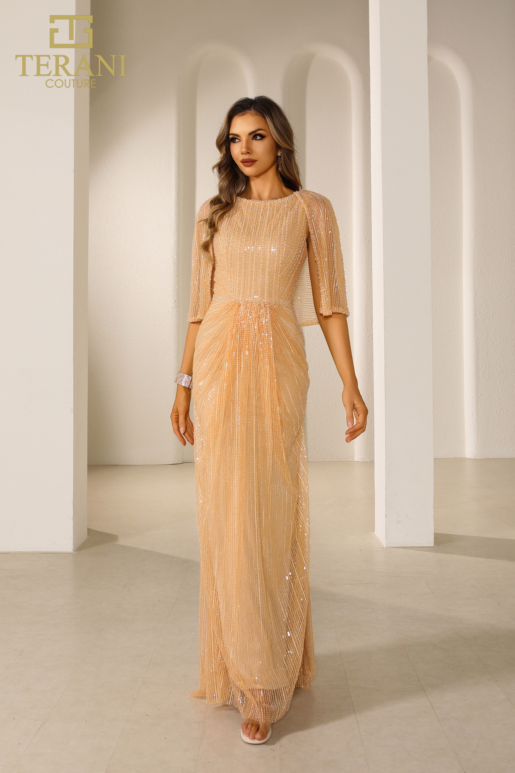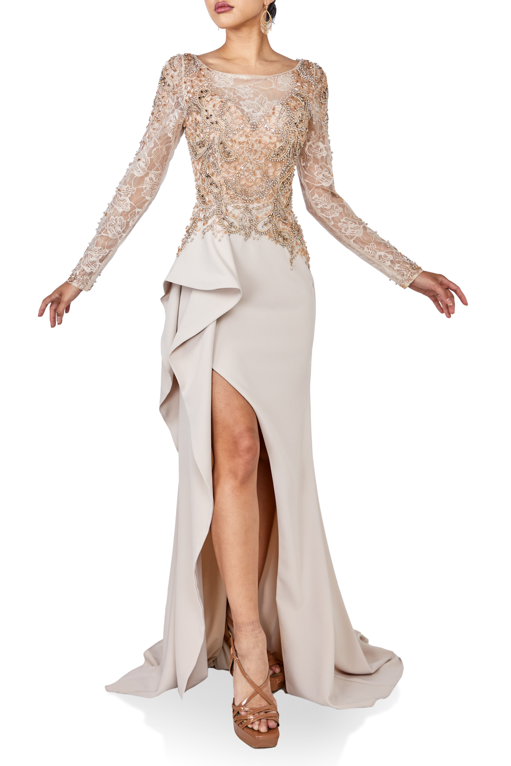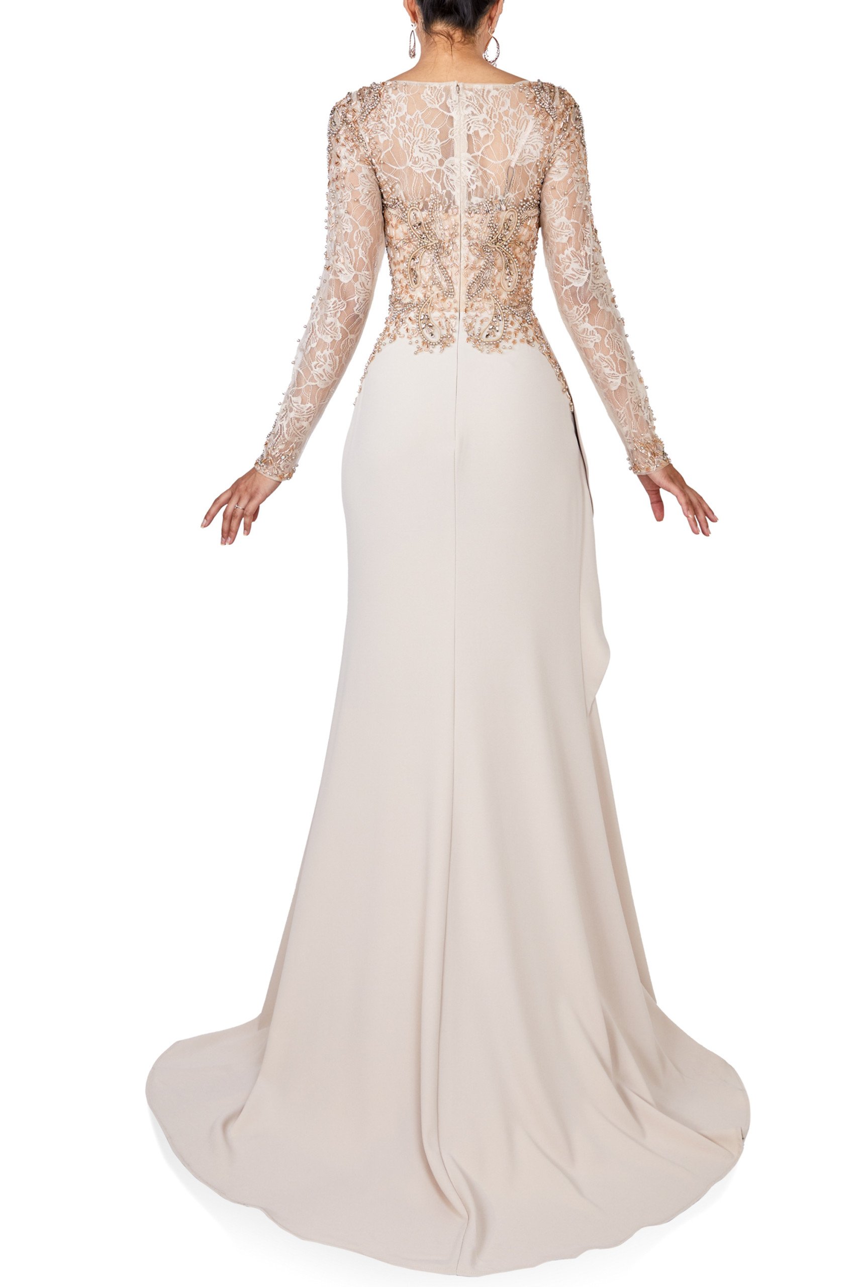 - Pleated off shoulder wrap collar leads to a side drape with matching bead applique.