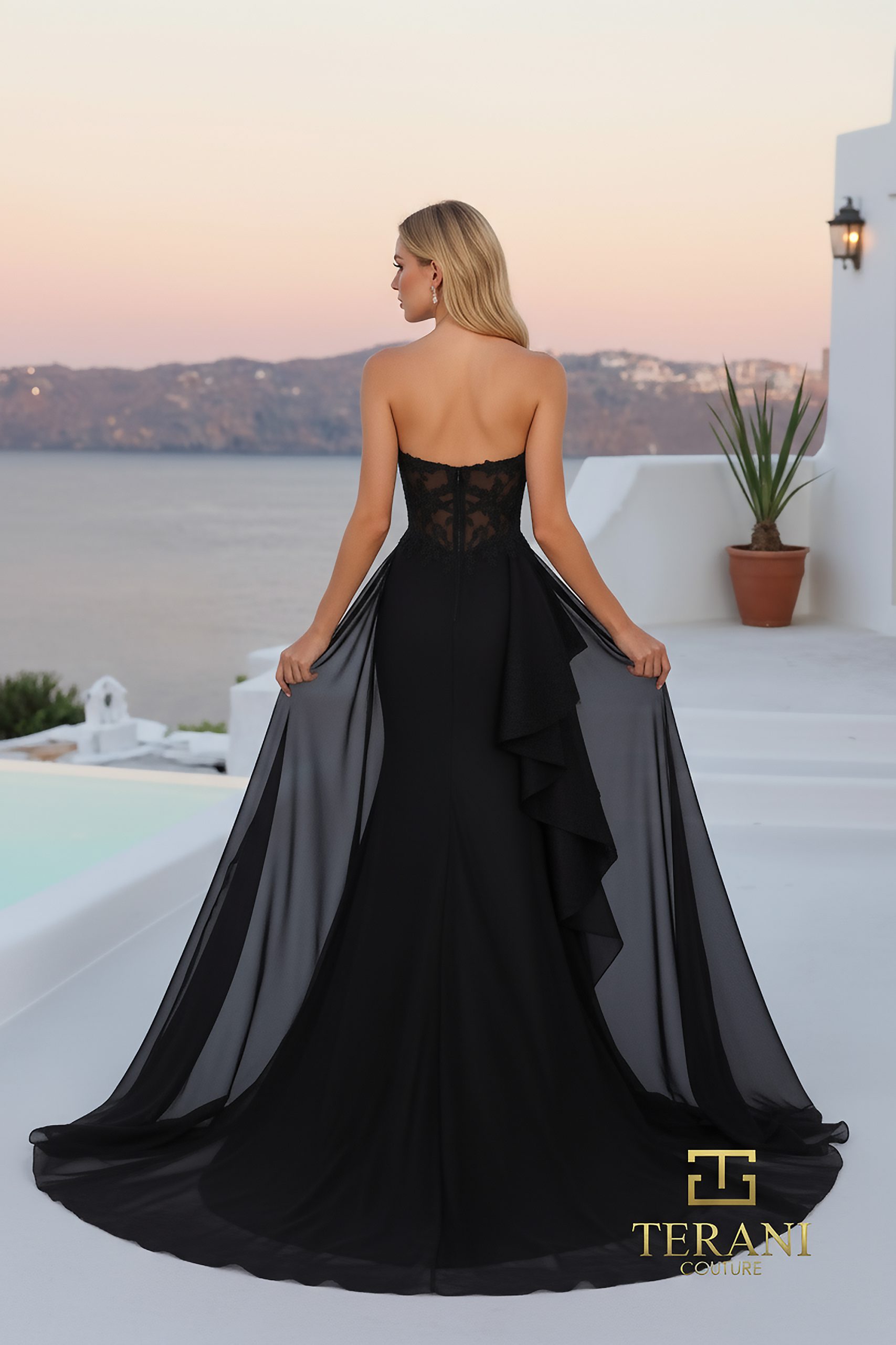 - Stretch crepe off the shoulder collar leads to a midriff of embroidery and beads. This evening dress features a peplum side detail and full skirt bottom.