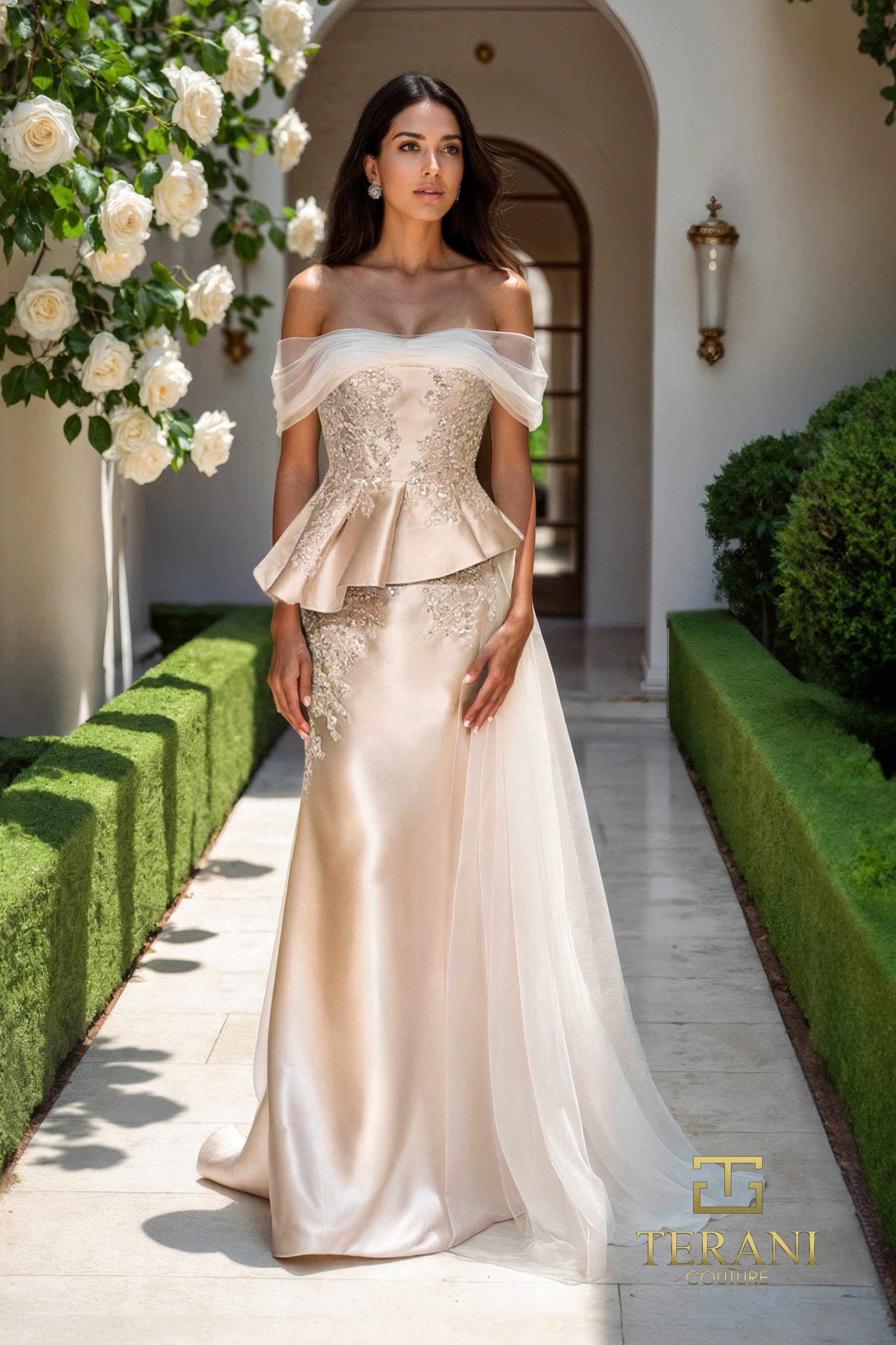 Draped off Shoulder Stretch Jacquard Gown – 1921M0726