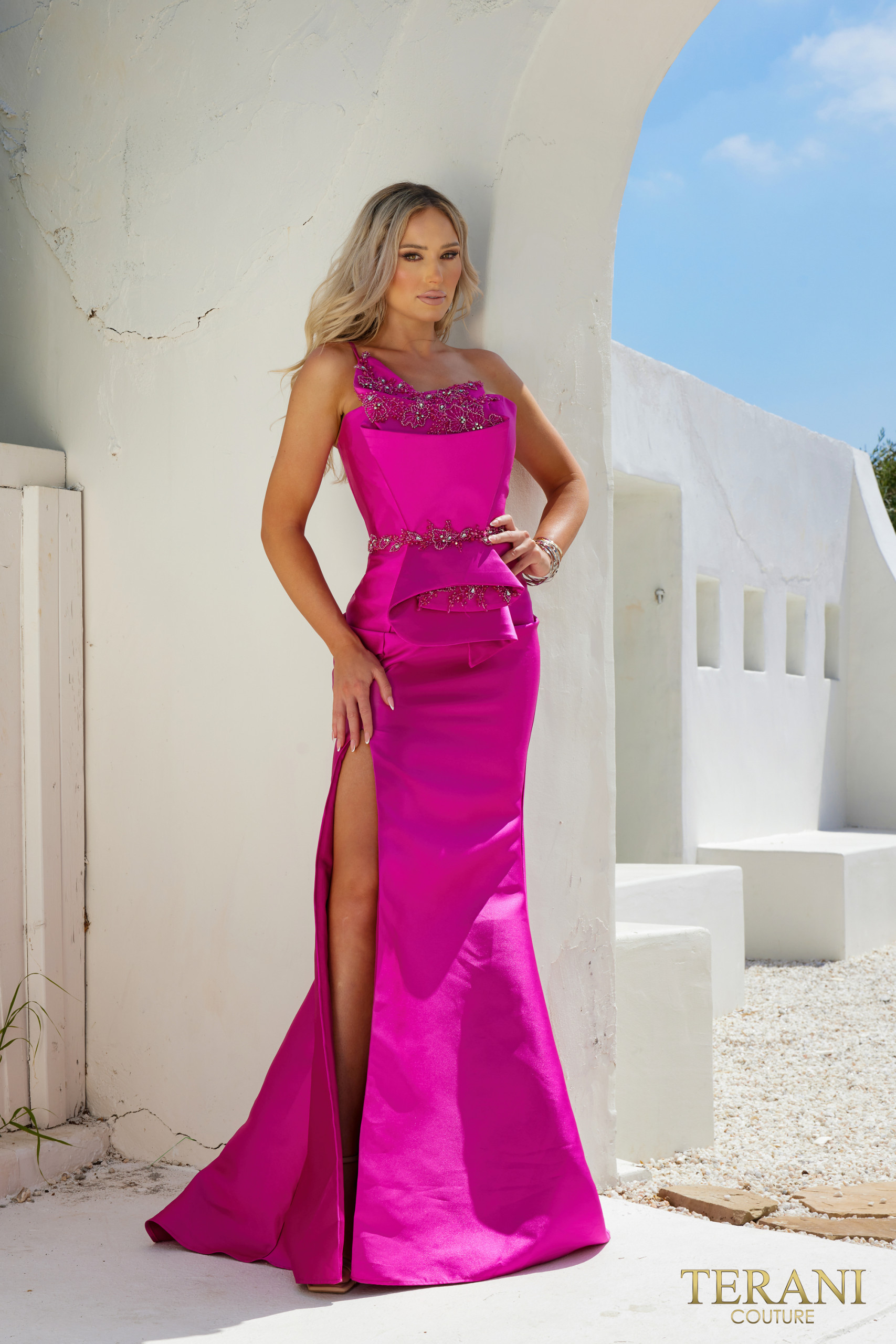 - Architectural wrapped torso gown detailed with stones. This slim fit gown has one shoulder and side slit