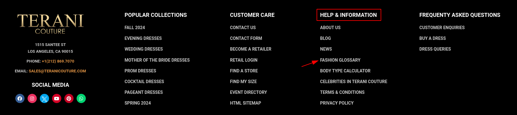 The Terani Couture Fashion Glossary is essential for appreciating the artistry behind our exquisite collections. Understanding key fashion terms enhances your experience and allows you to select the perfect pieces for any occasion. Our versatile silhouettes, dazzling details, and luxurious fabrics are designed to make you look and feel truly fabulous. To visit our site’s glossary page, find the “Help and Information” section in the footer and click on the “Fashion Glossary” menu.