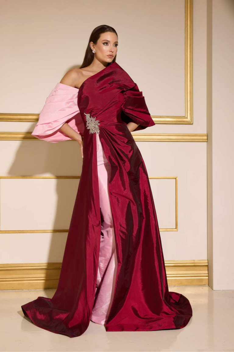 Silhouette & Structure: The dress features a dramatic fit and flare silhouette with a fitted bodice and a voluminous skirt that gracefully flows to the floor. The Asymmetrical neckline highlights the décolletage, while the structured bodice enhances the waist, creating an elegant hourglass shape.