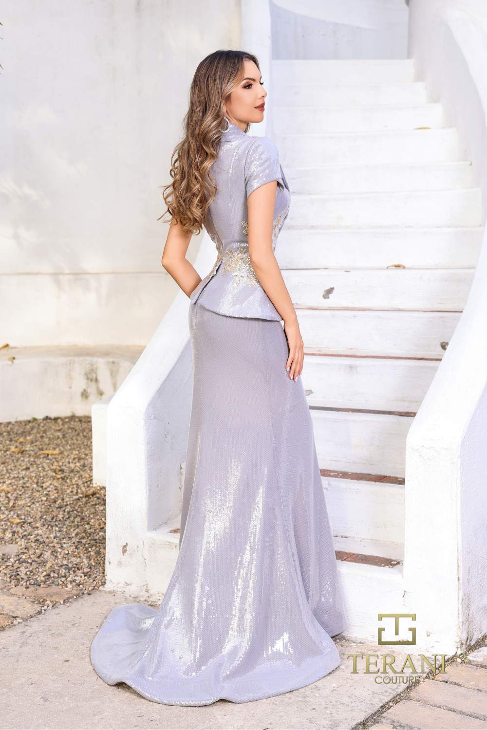 Silhouette & Structure: This dress features an elegant, mock 2 pc silhouette with a slight flared bottom, enhancing the graceful lines of the wearer. The design incorporates a peplum detail at the waist, creating a flattering hourglass shape while adding structure. The high slit on the side adds a touch of allure, complementing the overall sleekness of the gown. The dress is further defined by a soft, flowing train that trails gracefully behind, adding a sense of movement and drama.
