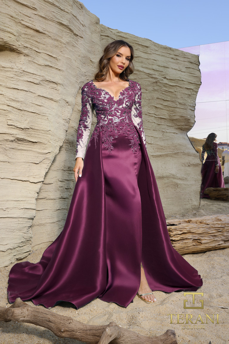 Silhouette & Structure: This dress features a beautiful fitted over skirt silhouette that flows elegantly into a train, creating an A-line shape that enhances the natural curves. The high slit adds a dramatic touch, giving the gown a sensual yet refined look. The structured bodice, detailed with intricate floral lace embroidery, beautifully shapes the torso while providing a flattering and balanced fit.