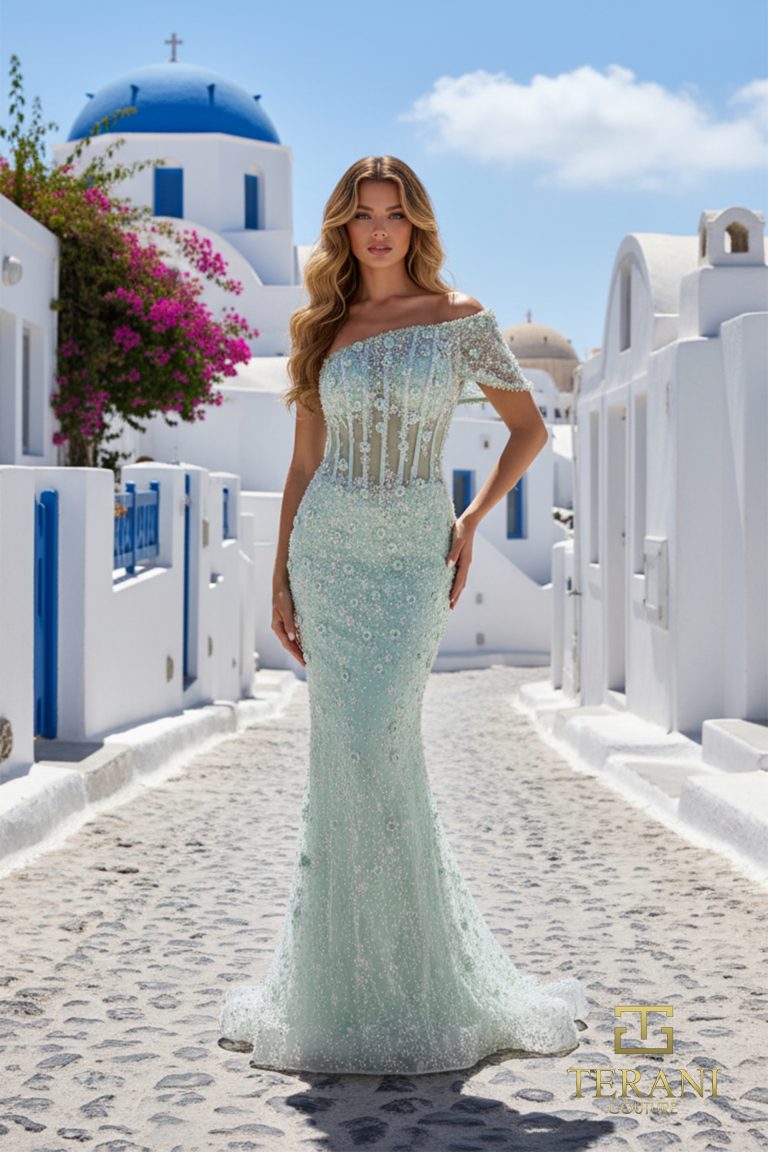 Step into the spotlight with the breathtaking Terani Couture 261GL6756 pageant gown, designed for those who demand elegance and drama. This long sheath silhouette is crafted from shimmering beaded tulle, catching the light with every move. Its off-shoulder asymmetrical neckline paired with a one-shoulder cap sleeve creates a striking modern shape, balancing sophistication with allure. The nude-blue palette lends a fresh, ethereal glow, perfect for pageants, red carpet events, or evening galas. Expertly tailored, the fitted bodice flows into a sleek column skirt, elongating the figure while the 46-inch hemline from the waist ensures graceful coverage. A center-back zipper with hook-and-eye closure offers a seamless finish, combining comfort with refined detail. Designed for women who want to captivate every room, this gown embodies Terani Couture’s signature artistry and timeless glamour.