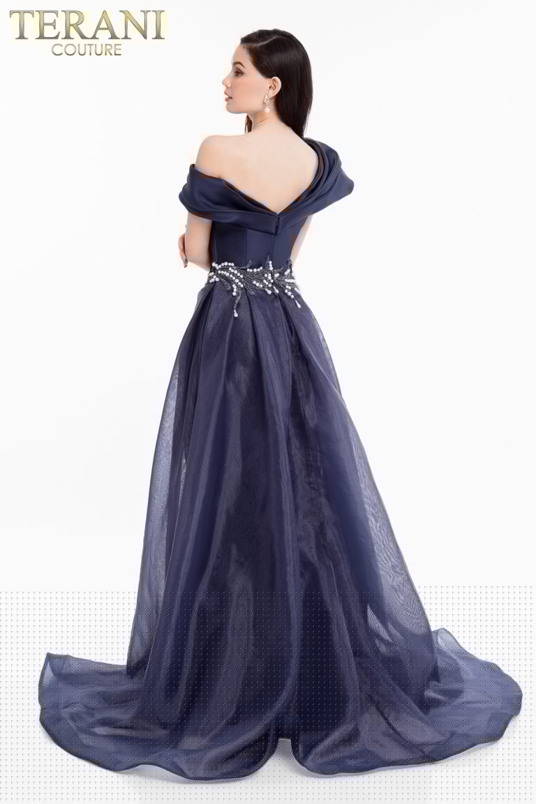Introducing a super elegant dress called the Asymmetrical Pleated Off-Shoulder Neck Waist Detailing Ball Gown-1821E7100. It comes in two beautiful colors, Ivory and Navy. This dress looks really fancy and stylish.
