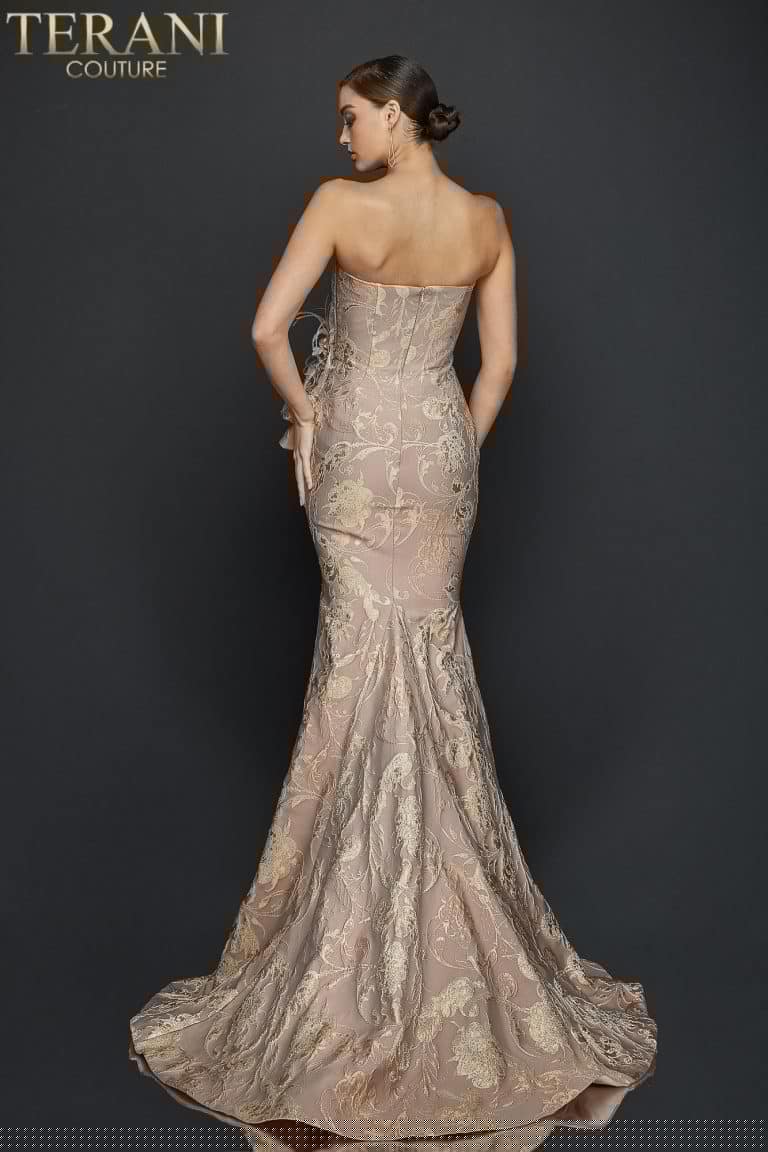 Dramatic pleat fan fabric detail make this Jacquard gown become a 3D gown.