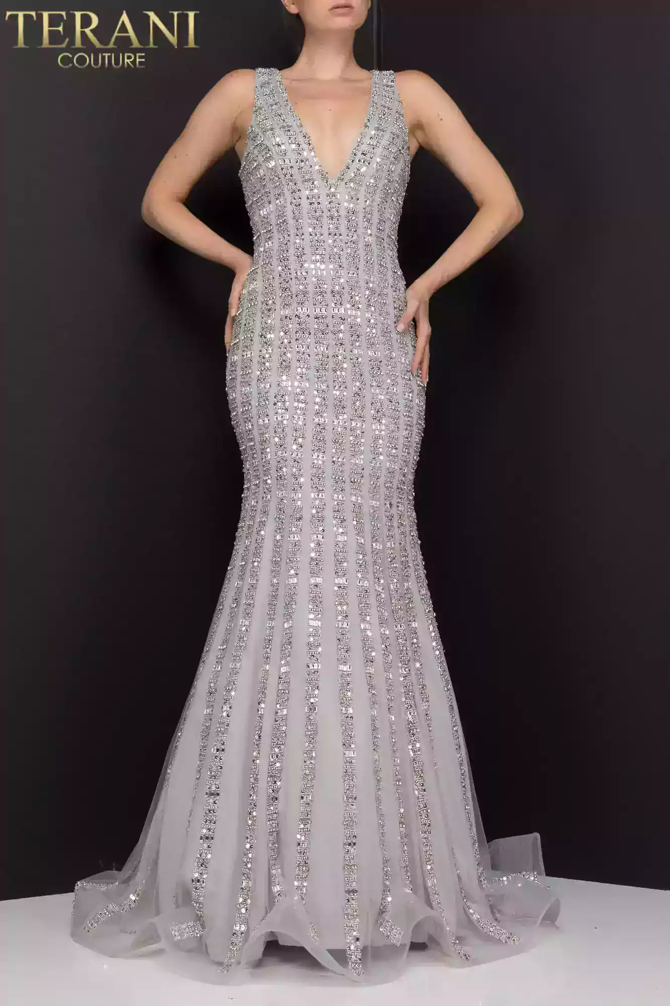 In this Terani Couture 2012P1285 design, you’ll rule every party like a statuesque beauty. This dress has a plunging v-neckline on a sleeveless form and is exquisitely adorned with beads in a textured stripe design. This outfit has a full back, sculpts around the hips, and has a train that flares to the floor. This Terani Couture masterpiece will envelop you in breathtaking splendor and will make you the center of attraction.