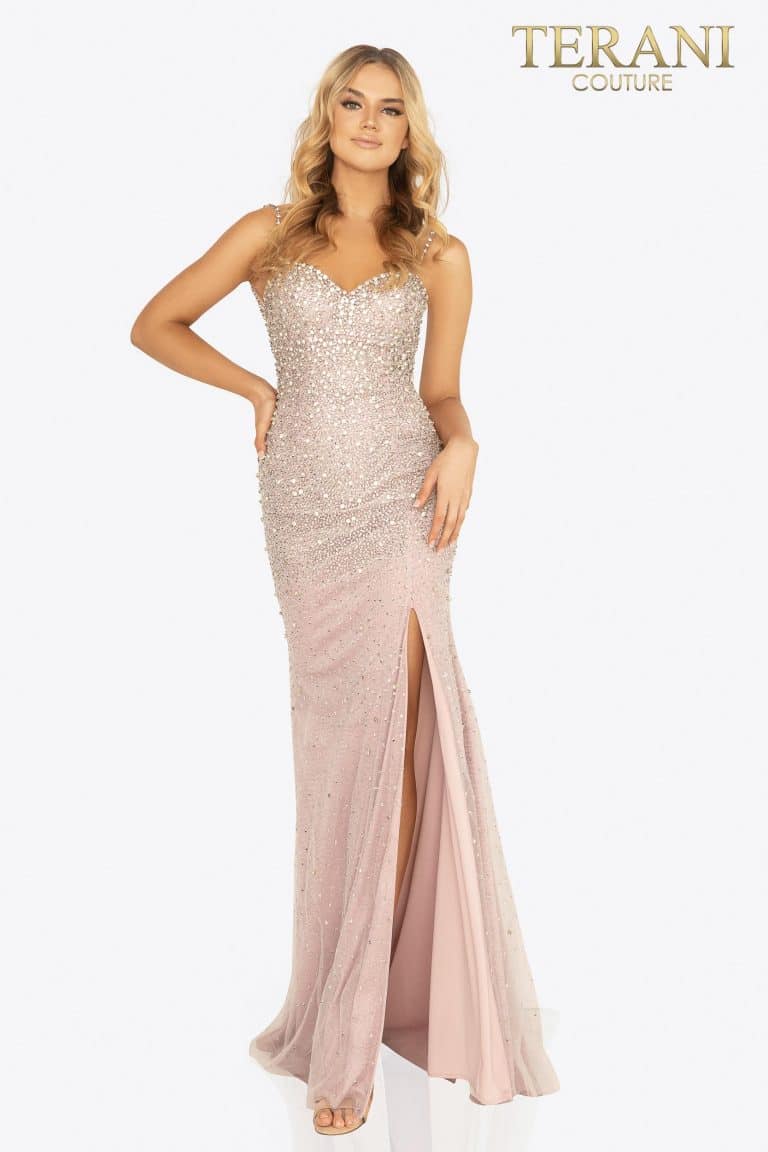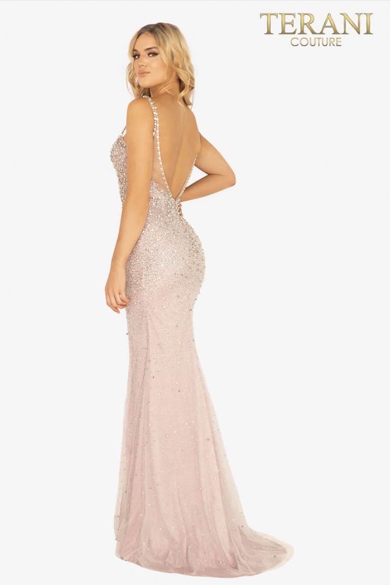 Dramatic crystal beads graduate from heavy to light on this gown with a side slit and sheer back