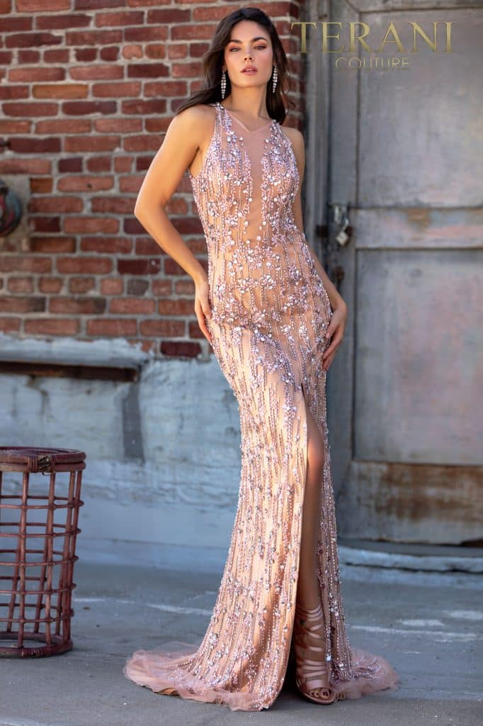 Wearing this dazzling Terani Couture dress with slit will ensure that you are the brightest star of the night. This show-stopper has a jewel neckline on a sleeveless bodice and is adorned with beading that trails down the mesh overlay and faceted crystals that enhance the overlay. The sheath skirt is constructed with a deep cutout in the shape of a diamond in the back, and it opens with a high slit just before it reaches the floor with a train. Wearing this Terani Couture illusion dress masterpiece will envelop you in an air of refined elegance. The floor-length gown features a slit that extends to the thighs. This high-neckline dress is available in blush, gold nude, and silver and all sizes so that you can easily pick the one that fits you.