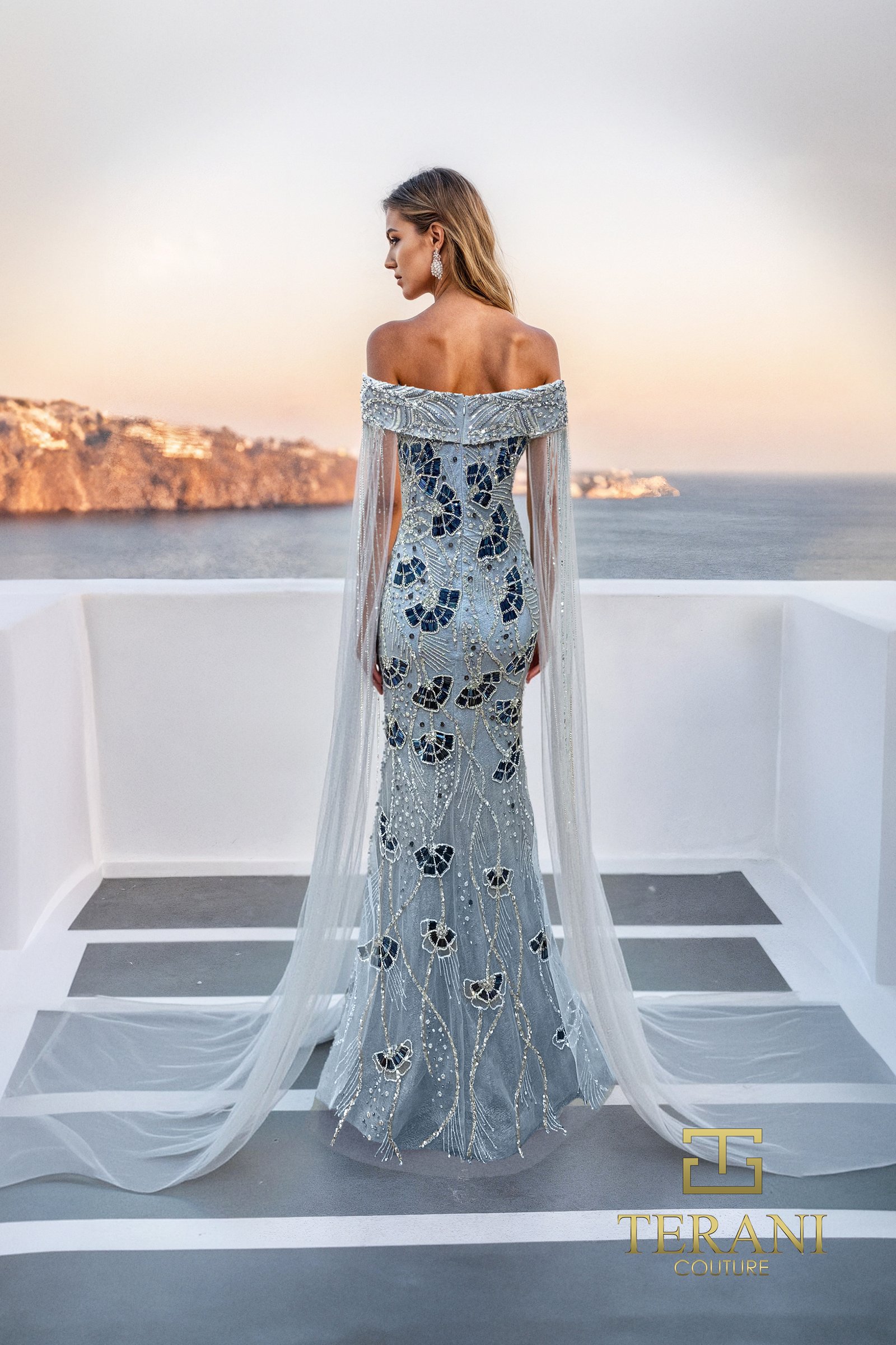 261GL6733 Sheath Gown is a breathtaking pageant dress designed with off-the-shoulder styling and dramatic cape sleeves. Crafted from intricately beaded tulle, the gown features a fitted sheath silhouette that highlights the figure with elegance and detail. Complete with a center-back zipper and hook-and-eye closure. Available in Blue Silver and Blush Silver.