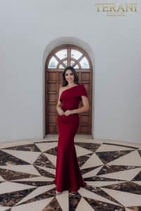 You’ll be a vision of feminine elegance in this sumptuous One Shoulder Long Mother of the Bride Dress from Terani Couture. In addition, This one-shoulder dress design to flatter the figure with an inset ruching over the waistline. Moreover, and a high slit on the skirt.