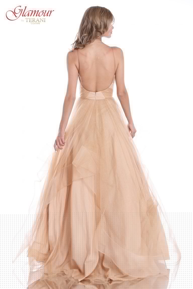 Step into the spotlight with our Spaghetti Strap Low Back Glitter Tulle Ball Gown-1811P5849J. This dress is perfect for special occasions when you want to feel like a princess. It has delicate spaghetti straps for a touch of elegance and a low back for a bit of allure.