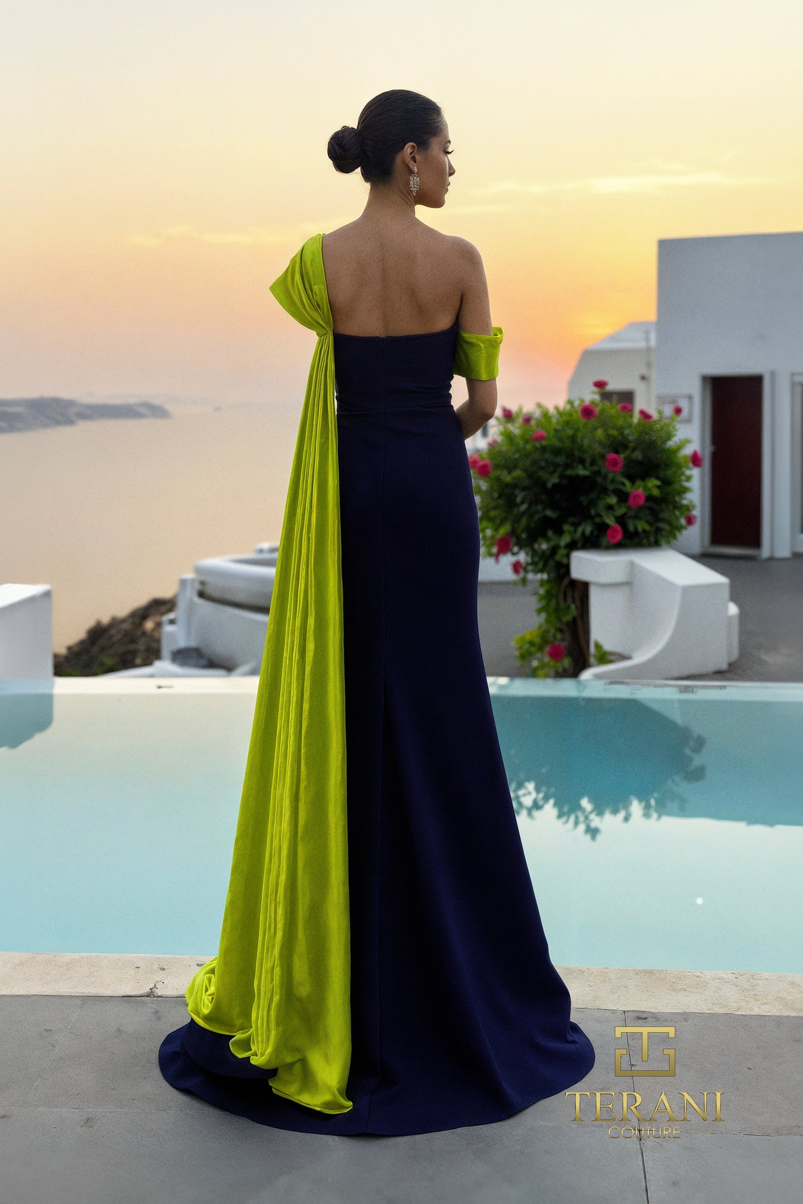 261E6223 Sheath Gown is a striking evening dress crafted from stretch twill with shimmer detailing. Featuring a straight neckline, the design is elevated with a dramatic draped citrine overlay that creates bold contrast against the sleek silhouette. Complete with a center-back zipper and hook-and-eye closure. Available in Navy Citrine, Black Citrine, and Fuchsia Citrine.