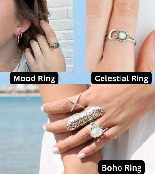 Mood Ring: Perfect ring that changes color based on body temperature, reflecting emotions. Celestial Ring: Inspired by the stars, moons, and galaxies. Boho Ring: Features nature-inspired or vintage designs. Often has turquoise or opals adorned in it. |