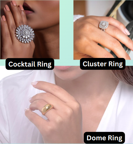 Cocktail Ring: Large, bold and mostly adorned with gemstones. Often has intricate designs. Cluster Ring: Multiple small stones grouped together. Dome Ring: Rounded and voluminous. Highlights a bold fashion statement. |