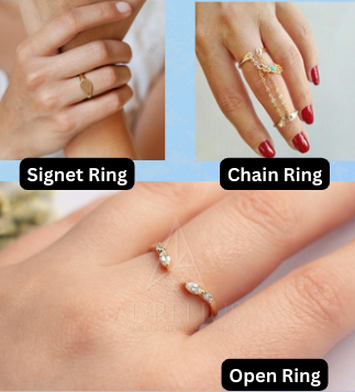 Signet Ring: Flat-top ring, usually engraved with initials or symbols. Chain Ring: Two tiny rings interlinked with tiny chains. Open Ring:Has a gap instead of a continuous band. |