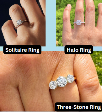 Solitaire Ring: Has a single gemstone, usually a diamond. Mostly set in a simple band. Halo Ring: Has a central stone with smaller stones. Three-Stone Ring: Has three large diamonds stacked on a band, representing the past, present, and future. |