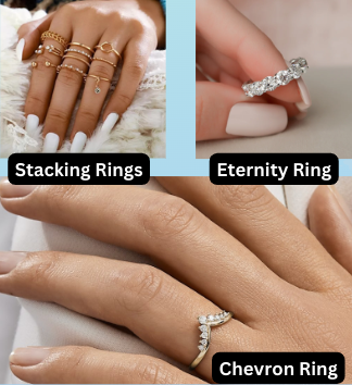 Stacking Rings: Thin bands stacked together. Eternity Ring: Solid band with gemstones adorned all around. Chevron Ring: V-shaped ring perfect for layering. |