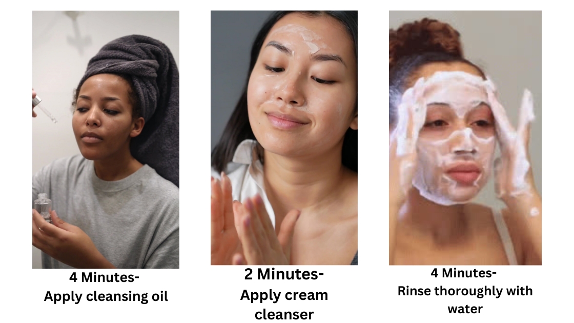 In this method, massage your face with cleansing oil for 4 minutes, then follow with a cream cleanser for 2 minutes, and finally rinse with water for another 4 minutes.