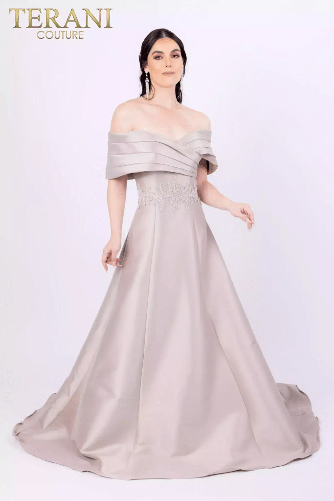 Embroidered Ballgown Dress with Pleated Off Shoulder Neckline